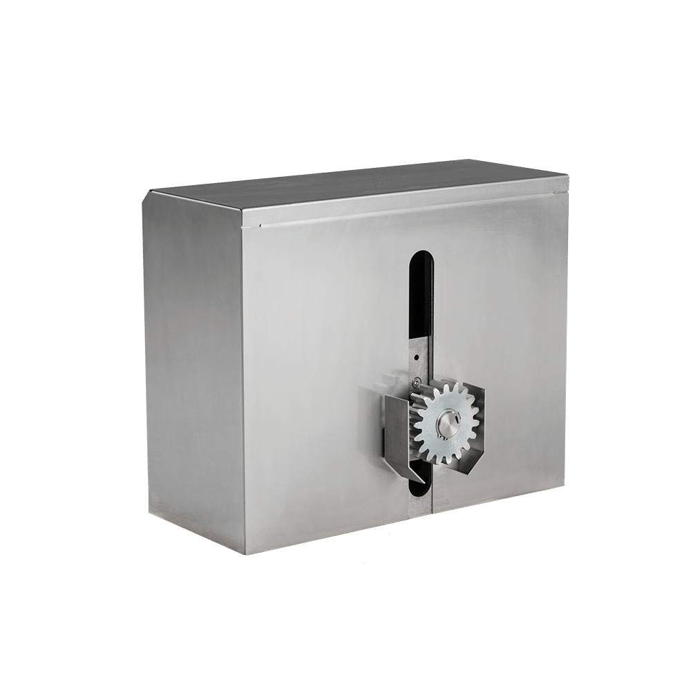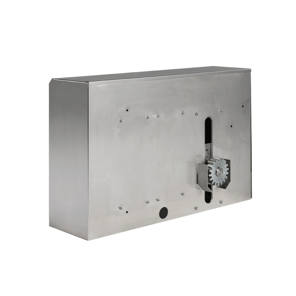 und für schwere Tore konstruiert. Die komplette Konsole und die Haube sind aus Edelstahl gefertigt. Auf Wunsch kann der Antrieb mit einem Kettenrad oder auch mit verlängerter Welle ausgerüstet werden.